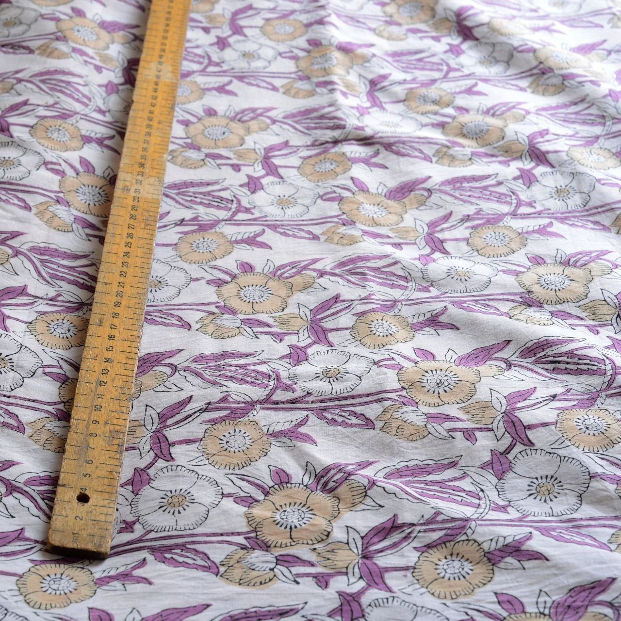 This lightweight cotton, hand-printed with a pretty floral. Its soft hand-loomed cotton and has imperfections that come from hand printing.