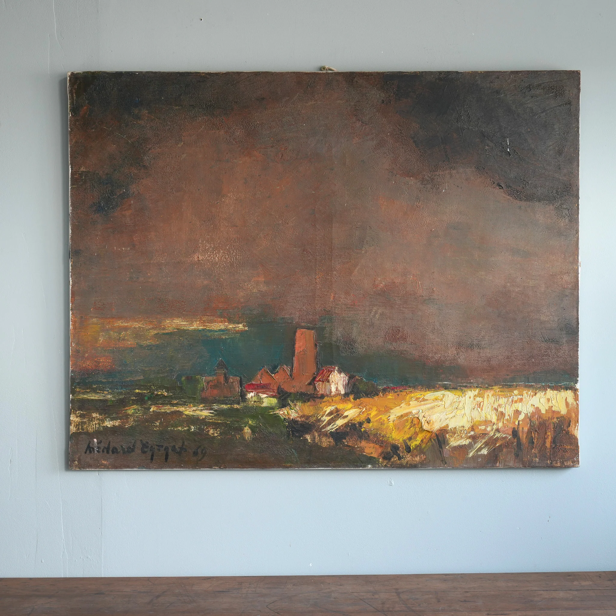 In this powerfully atmospheric work, the last light of day breaks through a turbulent, clouded sky, illuminating the horizon over a dark landscape. The artist, Médard Siegfried Tytgat, was a key figure in the second generation of Flemish Expressionists, and he applies their signature techniques with raw confidence; his energetic, almost violent, use of a palette knife builds a heavy impasto, giving the foreground a visceral, tactile quality. The painting almost certainly depicts the distinctive flat-topped tower of the Church of Our Lady of the Visitation in Lisseweghe, a village near Bruges, transforming the famous landmark into a stark, soulful silhouette. It is a superb example of Tytgat’s mature style, capturing the somber beauty of the Belgian polder landscape with profound emotional weight.