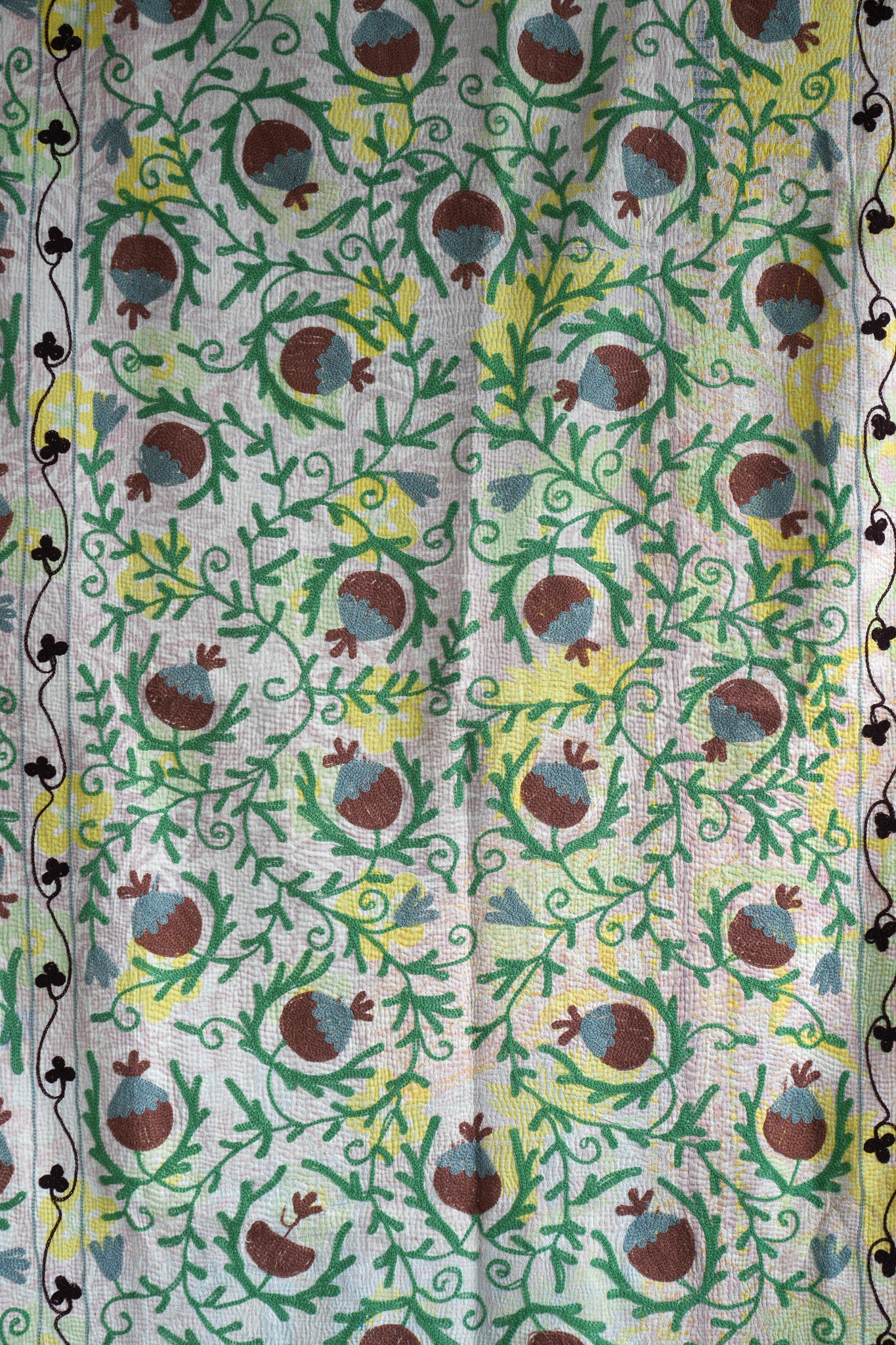This particular quilt has been further enhanced with more recent intricate Suzani embroidery, introducing an additional layer of history, colour, and pattern.