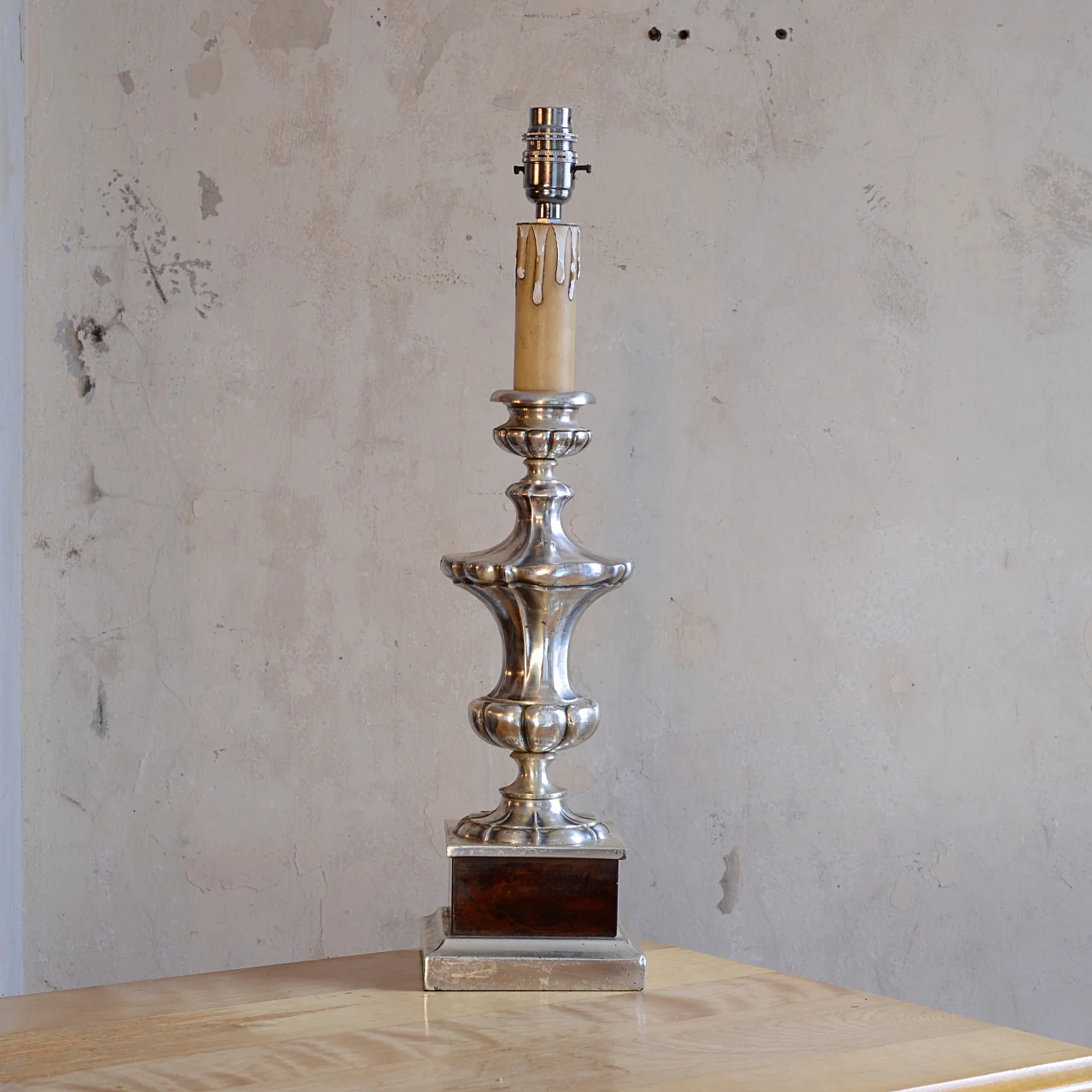 A silverplate table lamp with a faux tortoiseshell squared base.Â