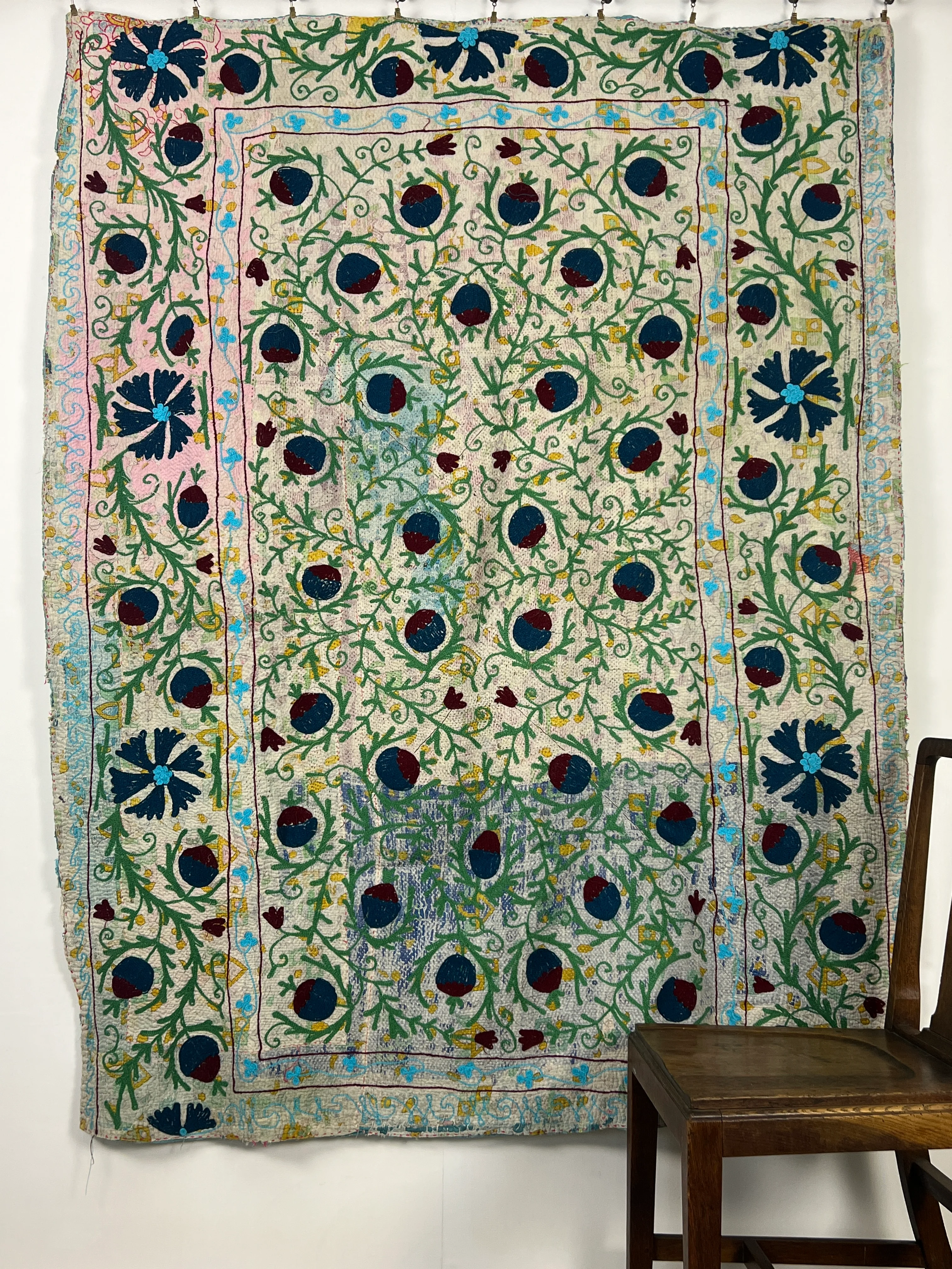 This particular quilt has been further enhanced with more recent intricate Suzani embroidery, introducing an additional layer of history, colour, and pattern.