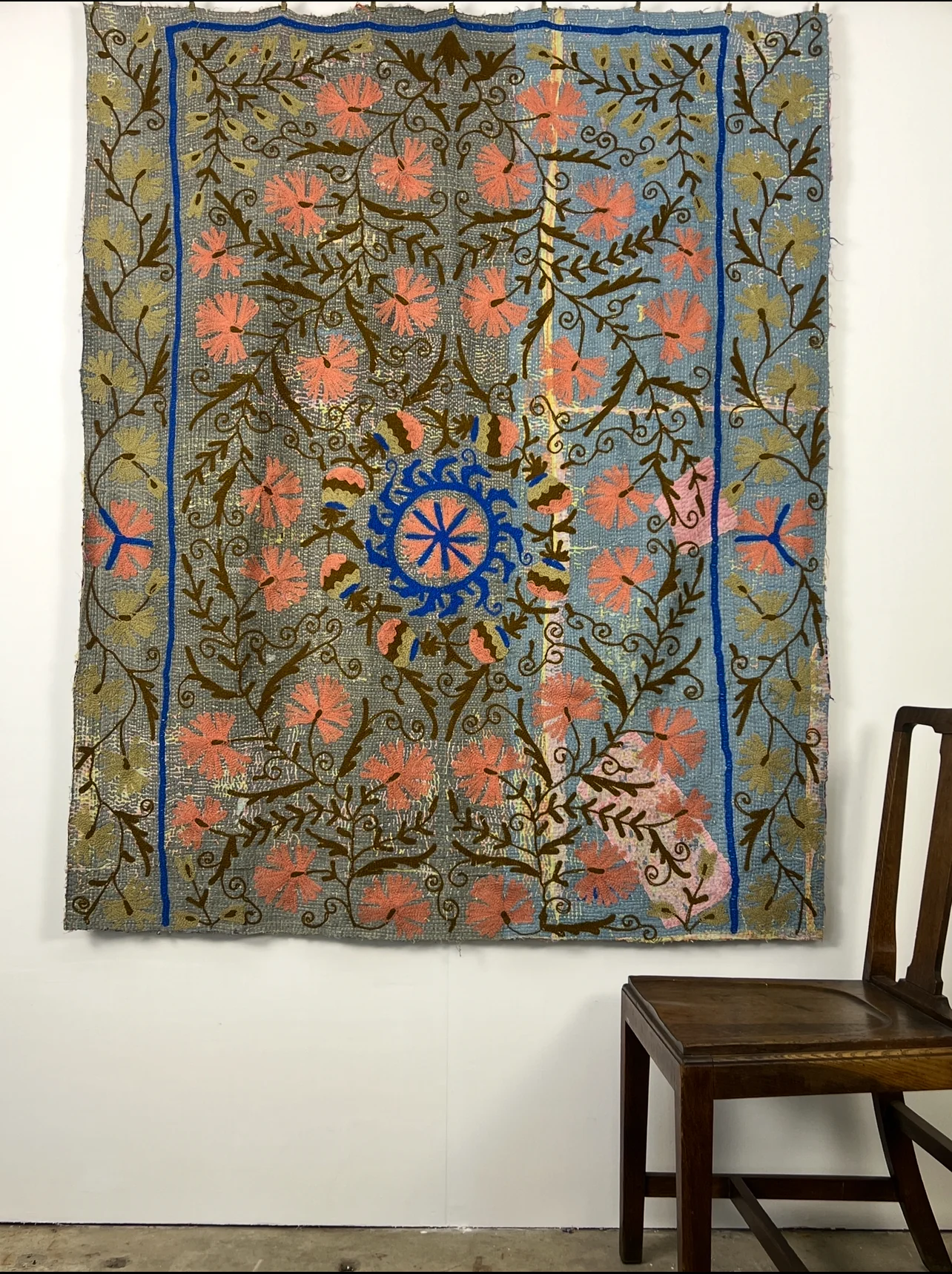 This particular quilt has been further enhanced with more recent intricate Suzani embroidery, introducing an additional layer of history, colour, and pattern.